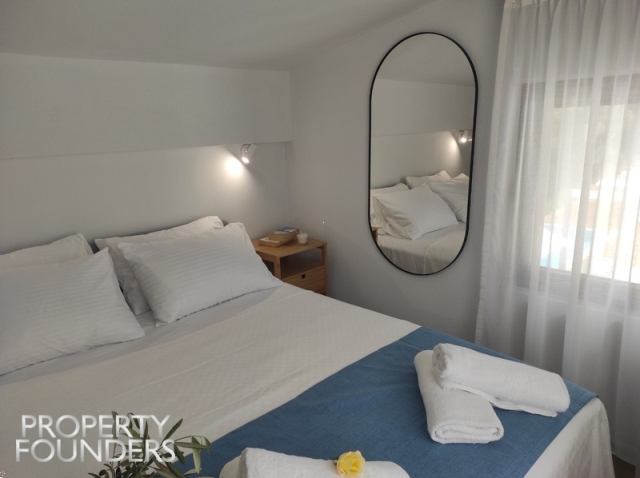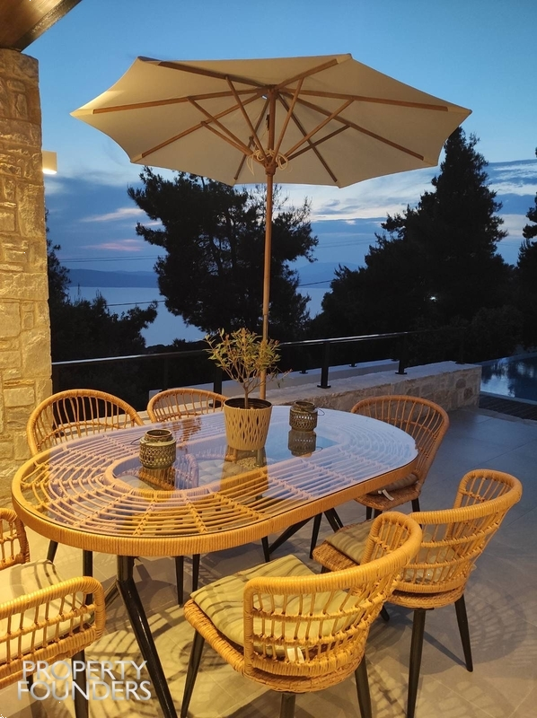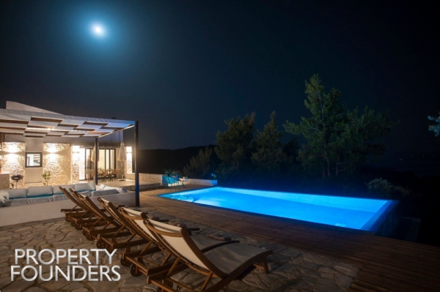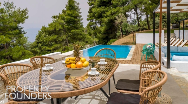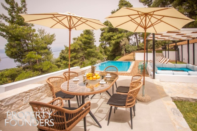 Sporades-Skiathos, Moni Evaggelistrias, Villa For Sale, 124 sq.m., Property Status: Amazing, Floor: Ground floor, 2 Level(s), 3 Bedrooms 1 Kitchen(s), 3 Bathroom(s), 1 WC, Heating: Autonomous - Electricity, View: Sea view, Building Year: 2021, Energy Certificate: C, 1 parking(s), Floor type: Tiles, Type of doors: Aluminum, Features: Security door, Storage room, Fireplace, Internet Line, Internal Staircase, Double Glazed Windows, Window Screens, Balcony Cover, Balconies, BBQ, Pets Allowed, No shared expenses, For Investment, Furnished, Luxury, Airy, Roadside, Bright, On Corner, AirConditioning, Solar water system, Trees, Swimming pool, Back yard (Garden), Painted, Suitable for Commercial Use, Distance from: Airport (m): 6000, Seaside (m): 1500, Price: 750.000€. Property Founders, Tel: 2168009848, email: [email protected]
