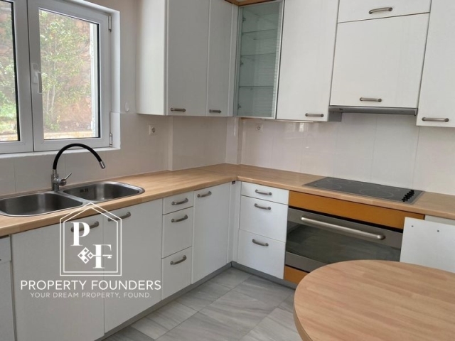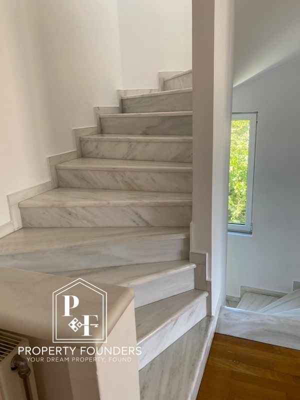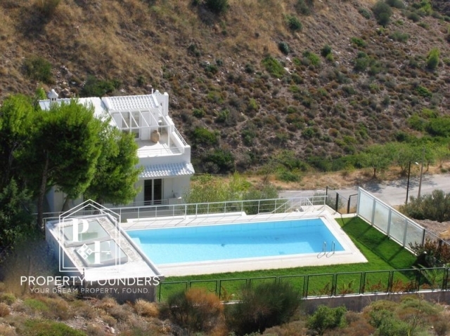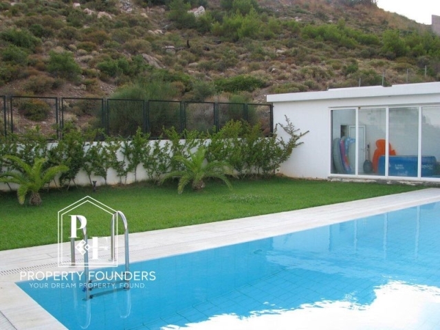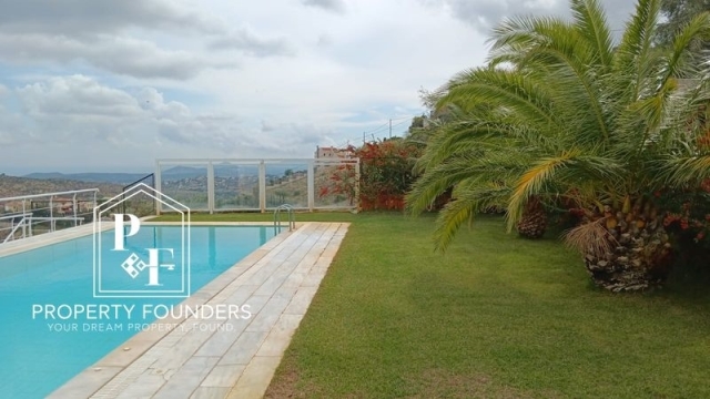 Property Founders  is pleased to offer for rent a 342 m2 detached house on a 1,100 m2 plot. 1st level open plan guest house with living room, bedroom, equipped kitchen, bathroom, with its own entrance. 2nd level Large living room with fireplace, dining room, equipped kitchen, wc 3rd level 3 bedrooms 3 bathrooms 1 office 4th level open plan hall bedroom living room kitchen and 1 bathroom, large terrace with unlimited mountain and sea views Other: Closed garage for 2 cars, one adult swimming pool and one children's, with a small covered area with shower, toilet and sink. It has Borehole, Generator, Solar, Heat pump heating cooling, Oil heating with autonomy on each floor, and alarm. The garden has a lot of green lawn, shrubs and trees. For more information or to visit the property please call 2168009848, 6943227777